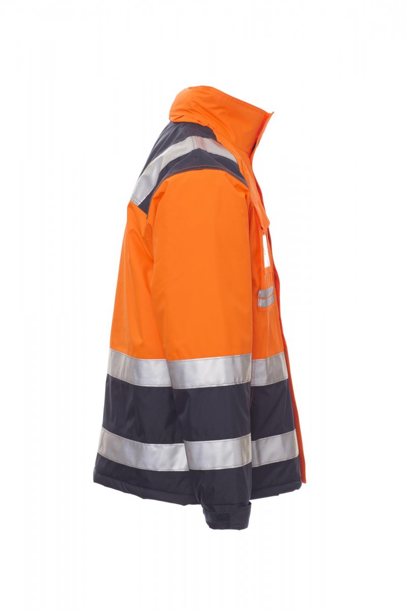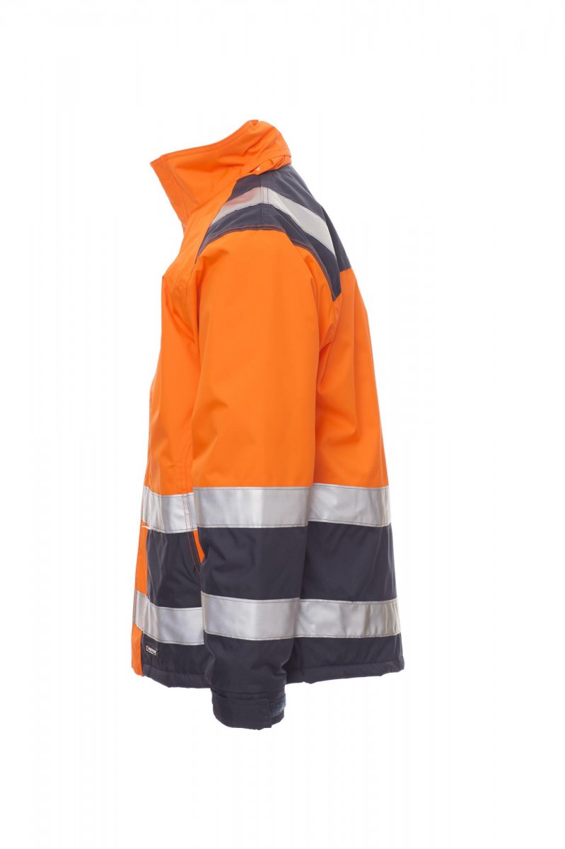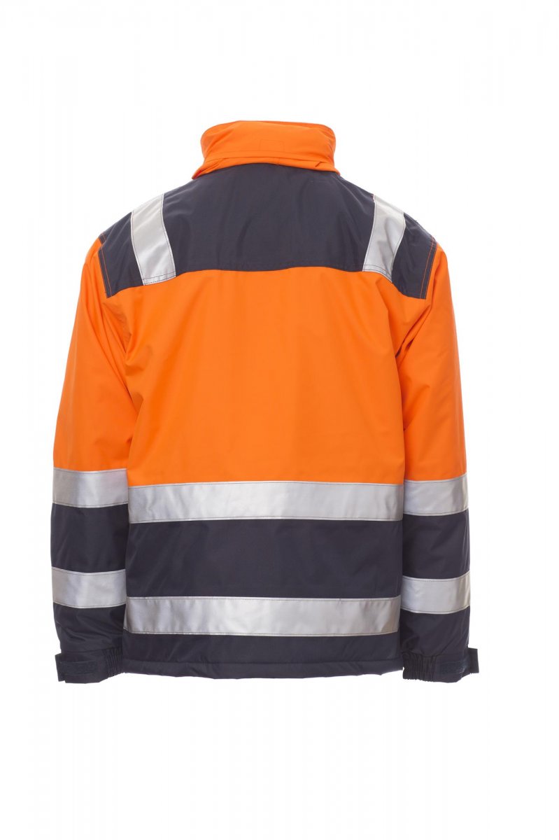 Tweekleurige herenjas met hoge zichtbaarheid, met reflecterende strepen, opening met kunststof rits met metalen runner met overslag en klittenband, uitvouwbare capuchon, mouwen met polssluiting, elastische, verstelbare manchetten, twee afgedekte zakken vooraan met rits, een borstzak met badgehouder afgedekt met een klep en gesloten met klittenband. Niet-afneembare gewatteerde binnenkant, met kraag en schouders van fleece, één binnenzak. Gesealde naden.