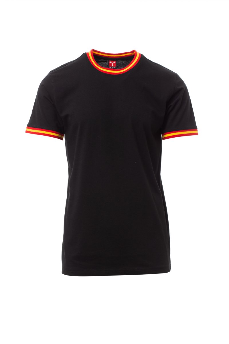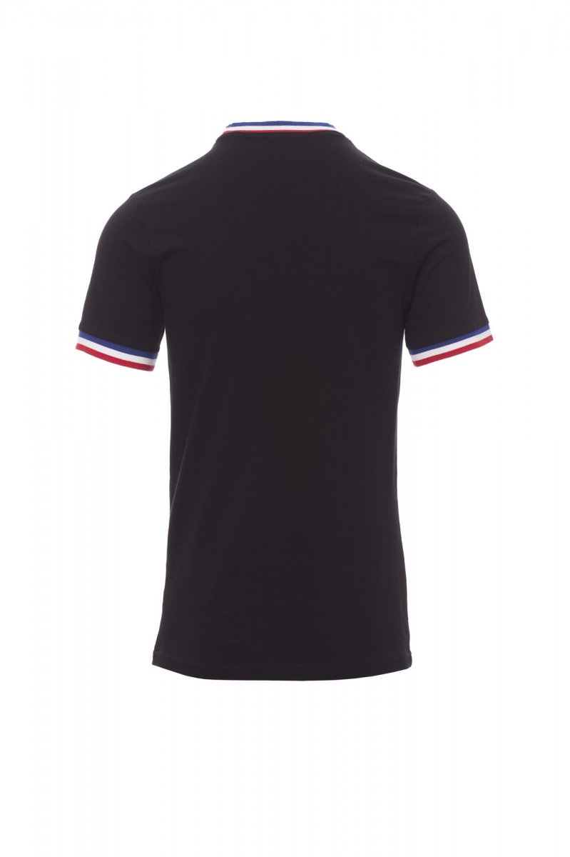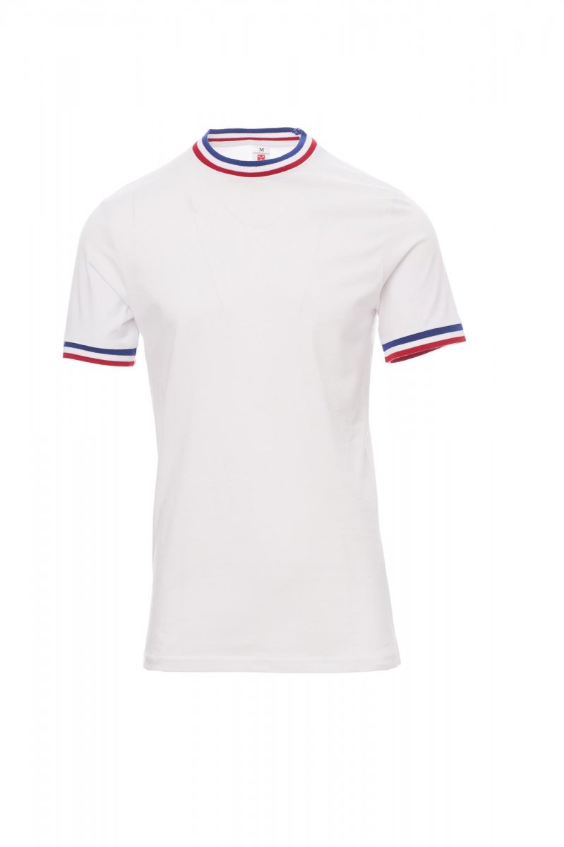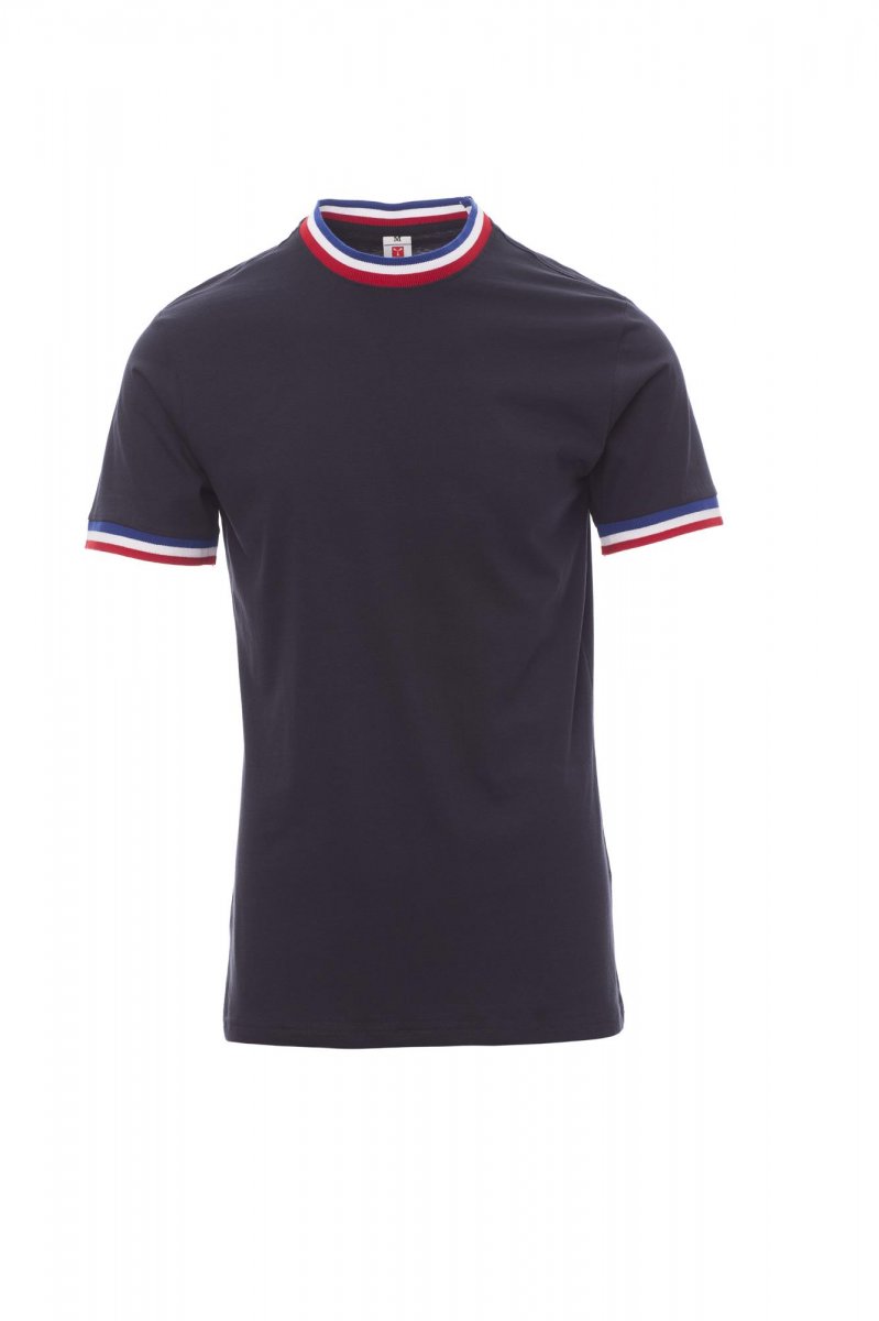 Heren-T-shirt met korte mouwen en ronde hals, contrasterende afgezette halsrand en mouwranden (kleuren van de vlag) van 2,3 cm van een mix met spandex met stiksel aan de buitenkant, versterkingsband van schouder naar schouder, elastische naden, zijnaden.