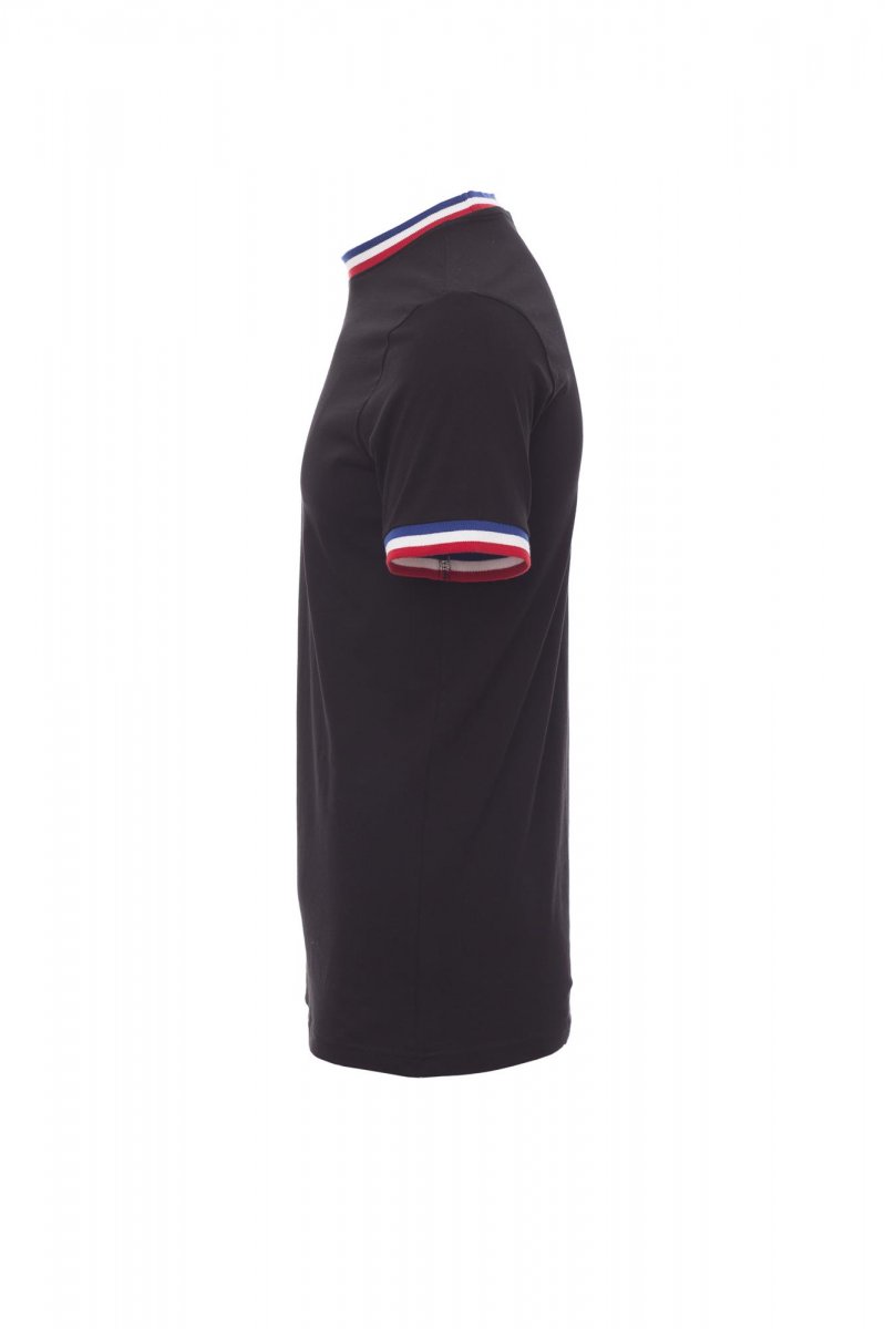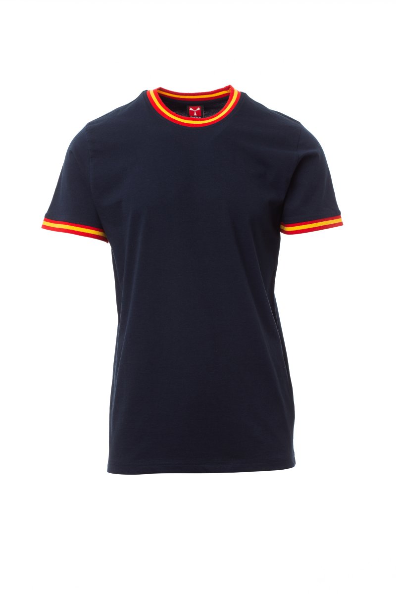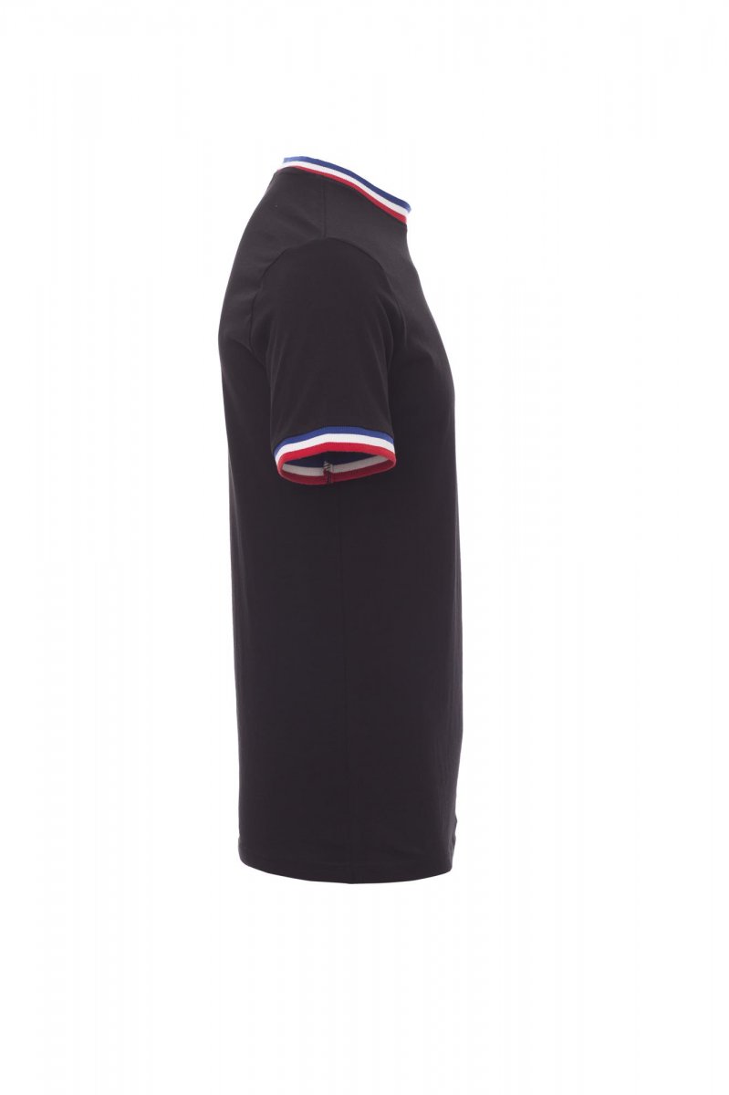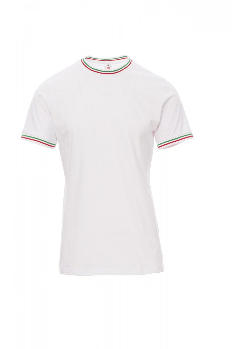 Heren-T-shirt met korte mouwen en ronde hals, contrasterende afgezette halsrand en mouwranden (kleuren van de vlag) van 2,3 cm van een mix met spandex met stiksel aan de buitenkant, versterkingsband van schouder naar schouder, elastische naden, zijnaden.